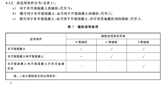 根據(jù)行業(yè)標準JG/T 160-2017,機械錨栓可按使用條件分為三類,包括適用于非開裂混凝土的N類錨栓;可用于非開裂,也可用于開裂混凝土的C類錨栓;以及既可用于非開裂,也可用于開裂混凝土,并可承受地震作用的S類錨栓。