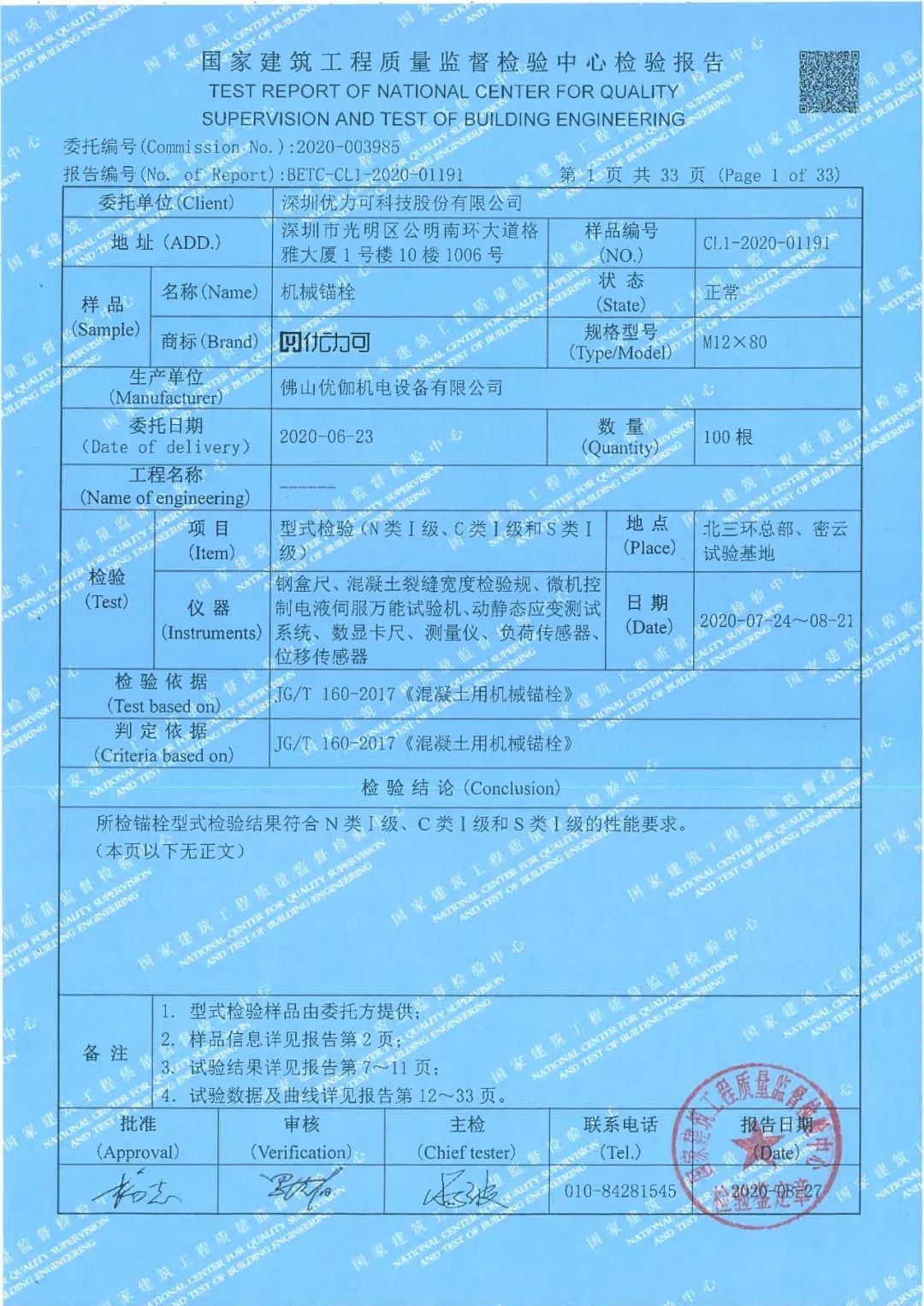 優(yōu)力可錨栓,不僅具有高顏值,更具有高性能。在非開裂混凝土上的拉拔測試中,抗拉抗剪承載力高,且破壞形式全為鋼材破壞,設計力值高,無論是抗拉抗剪、還是適應性測試,變異系數(shù)都非常小,數(shù)據(jù)穩(wěn)定,更重要的是,優(yōu)力可錨栓擁有良好的抗震性能,無論是S級適應性試驗、還是裂紋變幅往復開合試驗,都難不住它。