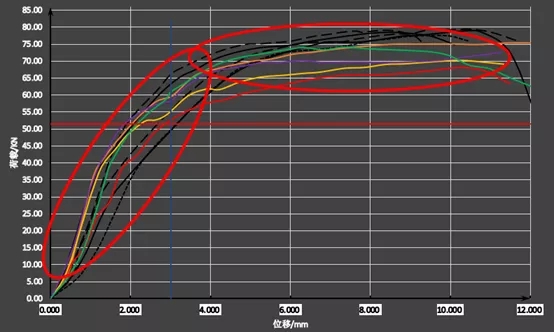 ■ 折線斜率小,前期拉拔位移時,輸出力值緩慢;