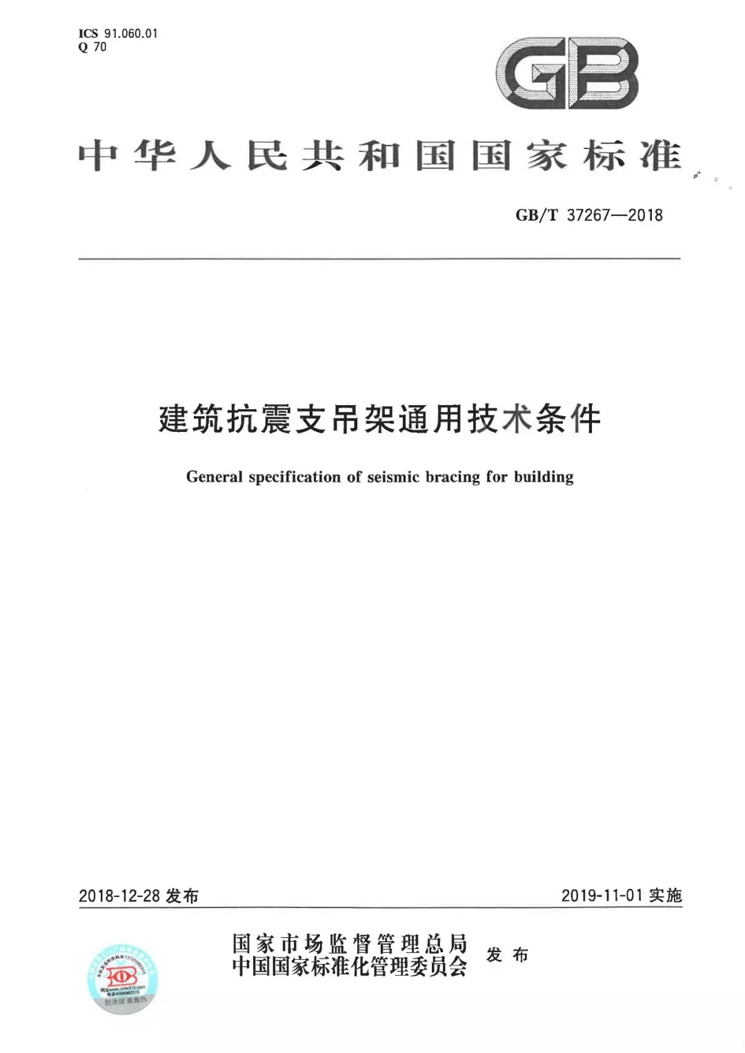 2018年12月28日,國家標準委發(fā)布2018年第17號中國國家標準公告,國家標準《建筑抗震支吊架通用技術(shù)條件》標準號為GB/T37267-2018,將自2019年11月1日起實施。